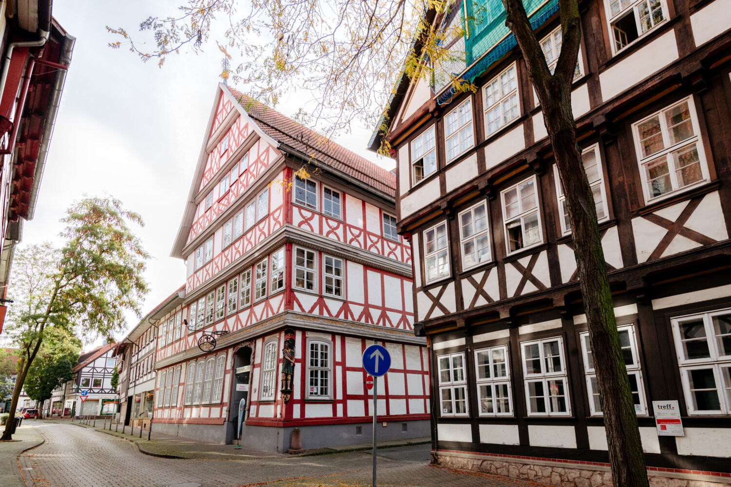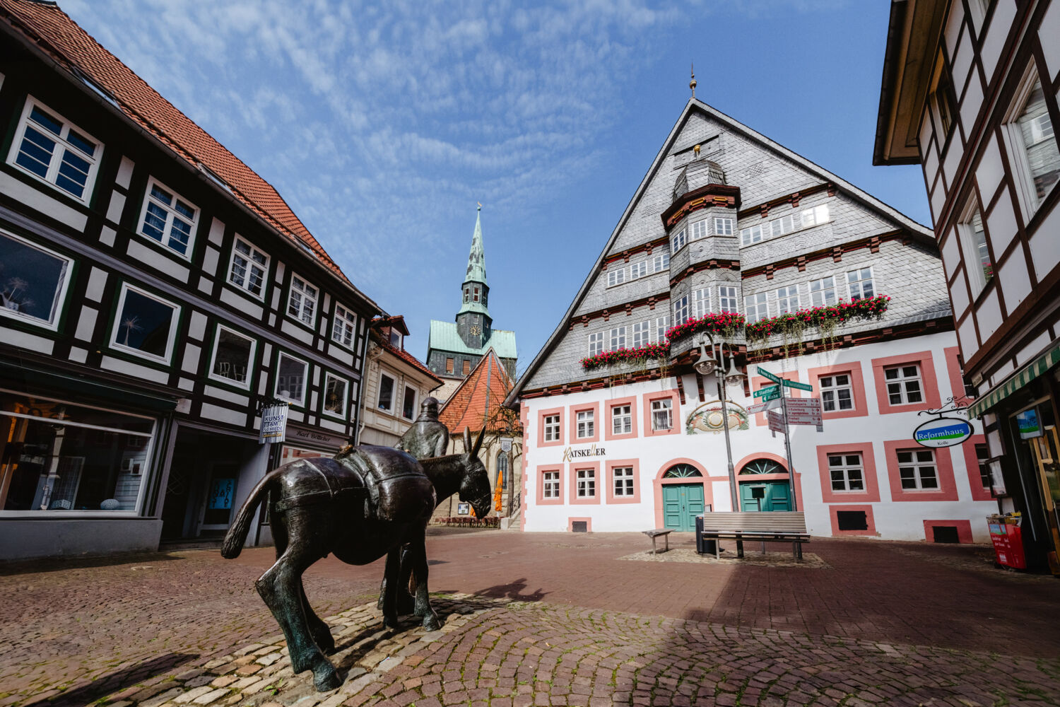 Das im 14. Jahrhundert erbaute Rathaus wurde 1545 beim großen Stadtbrand zerstört. 1552 wurde das Gebäude auf den alten Grundmauern wieder neu errichtet. Ursprünglich war der Giebel mit reichem geschnitzten Fachwerk versehen und im 19. Jahrhundert mit Schieferplatten behängt. Die dort angebrachte Walfischrippe sollte als Talisman die Stadt vor Hochwasser der Söse schützen.